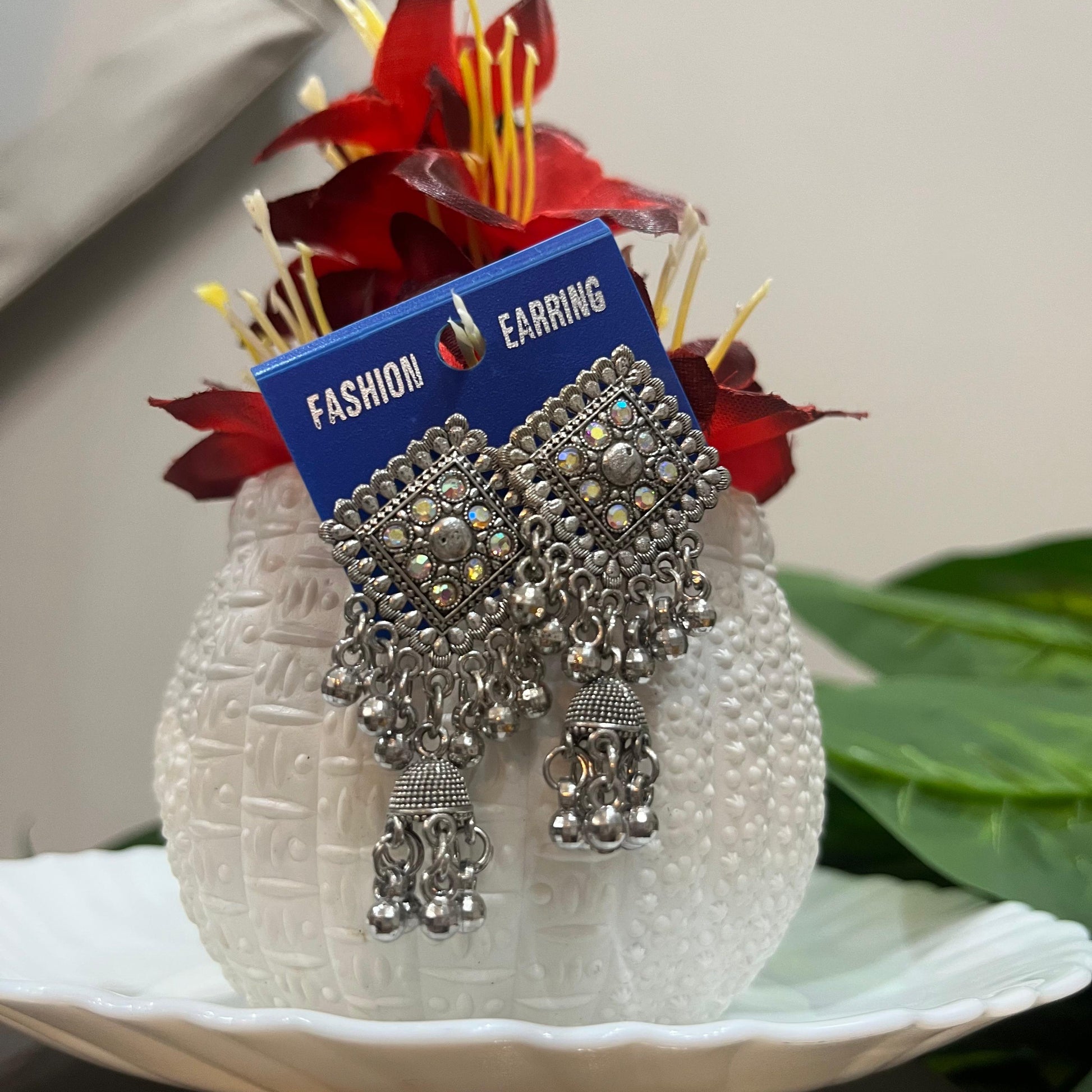 The bottom features classic jhumka style domes with hanging clusters of small silver beads. These statement earrings are sure to draw attention and beautifully complement suits, sarees, and lehengas.